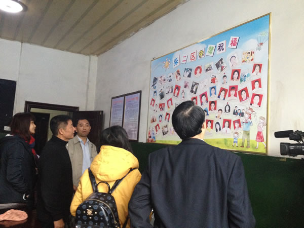 圖為記者們饒有興致地參觀安源煤礦采區(qū)進(jìn)班室《親情祝!穳