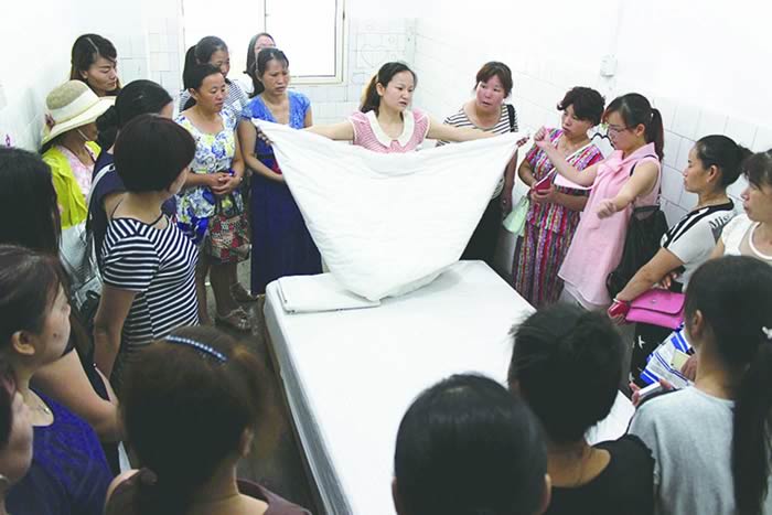 圖為轉(zhuǎn)崗分流人員培訓(xùn)現(xiàn)場(chǎng),授課教師鐘燕林正在傳授保潔技能。