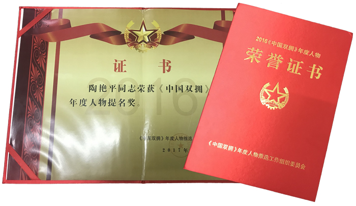 繼2015年榮獲《中國雙擁》年度人物提名獎后,近日,“兵媽媽”陶艷萍又收到一本由萍鄉(xiāng)市雙擁辦領(lǐng)導親自送來的榮譽證書,時隔一年,她再一次榮獲《中國雙擁》年度人物提名獎。 《中國雙擁》年度人物均為利用自身力量在愛國擁軍工作中,特別是為深化軍民融合發(fā)展等作出突出貢獻的模范典型。盡管年事已高,去年還曾做了心臟手術(shù),但自1968年第一次走進軍營直到現(xiàn)在,49載,陶艷萍從不曾忘初心,擁軍愛兵腳步從不曾停歇。她一次次走進軍營,無私幫助遠離父母的兵娃娃,為他們送去慰問品、宣講革命故事,為他們排憂解難、帶去歡樂,甚至遠赴珠海慰問消防官兵。近年來,她還經(jīng)常帶領(lǐng)一支文藝小分隊,穿梭于各軍營,為官兵慰問演出近百場。 49年如一日的堅持,寫就了濃濃的軍民魚水情!度嗣袢請蟆、《江西日報》、《萍鄉(xiāng)日報》、《江西衛(wèi)視》和《中國雙擁》雜志等媒體相繼對她進行了報道。各種榮譽也紛至沓來,多次被評為 “最美萍鄉(xiāng)人”,曾入圍“中國好人榜”,獲得《中國雙擁》年度人物提名獎、全國全省雙擁先進個人和萍鄉(xiāng)市道德模范等榮譽稱號。一本本鮮紅的榮譽證書,就是陶媽媽大愛無私的結(jié)晶。 “不忘初心、繼續(xù)前進、強軍有我!”這位76歲高齡的老人字字鏗鏘。