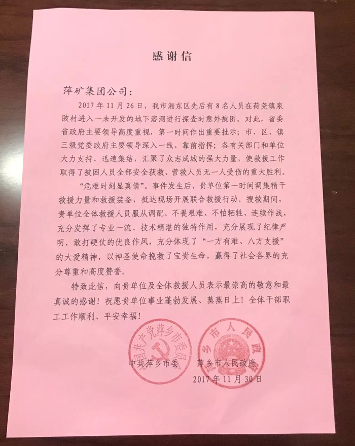 12月1日上午,萍礦集團(tuán)公司接到了一封萍鄉(xiāng)市委市政府送來(lái)的感謝信,對(duì)公司積極派人參與成功救援湘東荷堯地下溶洞人員被困行動(dòng)表示感謝。 26日上午10時(shí)30分許,有8人先后進(jìn)入湘東區(qū)荷堯鎮(zhèn)一未開發(fā)溶洞進(jìn)行探查時(shí)被困,牽動(dòng)了各級(jí)政府和百姓的心。經(jīng)過(guò)各方大力救援,27日成功救出3人,另有5名被困人員未找到。生命至上,人命關(guān)天。27日傍晚18時(shí)30分,萍礦集團(tuán)接到上級(jí)要求派員參與救援行動(dòng)的通知后,公司黨政領(lǐng)導(dǎo)高度重視,第一時(shí)間作出部署,抽調(diào)人員組織精干團(tuán)隊(duì),由副總經(jīng)理、總工程師彭群倫帶隊(duì),生產(chǎn)技術(shù)部副部長(zhǎng)鄒云福、安源煤礦機(jī)電副總工程師鄒林和制修廠副廠長(zhǎng)張其組成應(yīng)急救援小組,帶上相應(yīng)設(shè)備,立即趕赴人員被困現(xiàn)場(chǎng)。隨后,又派出了湘雅萍礦合作醫(yī)院應(yīng)急救援隊(duì)成員孫亞斌、肖饒軍、江麗和倪堅(jiān)組成的救援小組立即趕赴現(xiàn)場(chǎng)。 救援現(xiàn)場(chǎng),應(yīng)急救援小組成員憑借多年的工作經(jīng)驗(yàn)和專業(yè)優(yōu)勢(shì),積極參與救援。為更好地掌握情況,為指揮部制定科學(xué)的救援方案提供依據(jù),彭群倫和鄒云福等人進(jìn)入溶洞勘察地形。洞內(nèi)隧道寬窄不一,寬敞處多有暗河流經(jīng)或需涉水而過(guò),積水齊人腰深,不一會(huì)兒,幾個(gè)人全身都濕透了。狹窄處只容一人匍匐前行,堅(jiān)硬的巖石刺得手臂生痛,但大伙都沒(méi)有退卻。仔細(xì)觀察了地形地貌,了解情況后,彭群倫及時(shí)向指揮部進(jìn)行匯報(bào),并提出了救援建議。湘雅萍礦合作醫(yī)院應(yīng)急救援小組也一直堅(jiān)守在現(xiàn)場(chǎng),就地講授救援知識(shí),對(duì)因連續(xù)作戰(zhàn)出現(xiàn)虛脫的消防救援人員進(jìn)行醫(yī)療救援。 11月29日凌晨4時(shí)許,經(jīng)過(guò)科學(xué)救援,溶洞中最后5名被困人員被成功救出,且均身體狀況良好。直到這時(shí),堅(jiān)守現(xiàn)場(chǎng)的救援人員才長(zhǎng)長(zhǎng)地舒了一口氣。整個(gè)救援過(guò)程中,萍礦集團(tuán)公司領(lǐng)導(dǎo)密切關(guān)注現(xiàn)場(chǎng)救援情況,與應(yīng)急救援小組成員保持緊密聯(lián)系,從人力物力上給予支持。參與現(xiàn)場(chǎng)救援的人員紀(jì)律嚴(yán)明、服從調(diào)配、艱苦奮戰(zhàn),充分體現(xiàn)了國(guó)有企業(yè)的擔(dān)當(dāng)精神,和“一方有難、八方支援”的大愛精神,共同演繹了一場(chǎng)溫馨的小城大愛。(謝紅英 攝)