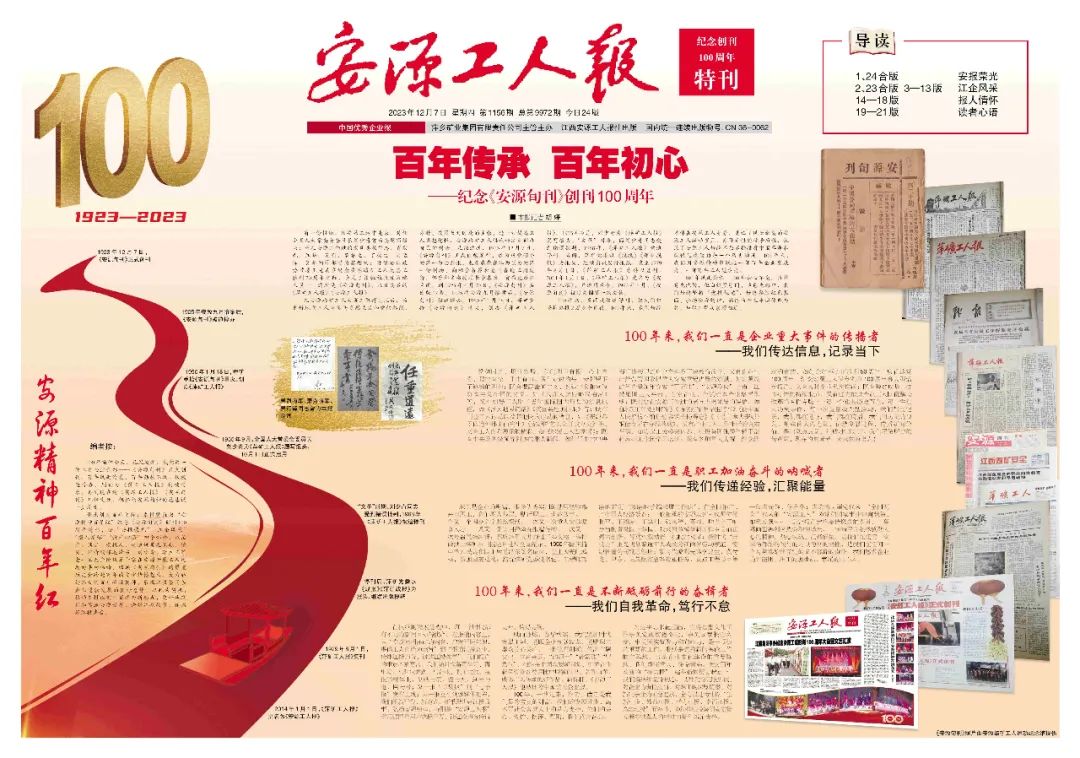 值此創(chuàng)刊百年之際,《安源工人報》推出“安源精神百年紅”紀(jì)念《安源旬刊》創(chuàng)刊100周年特刊,分“安報榮光”“江企風(fēng)采”“報人情懷”“讀者心語”四個部分24個版面,以記者、讀者、通訊員、老報人之筆觸、鏡頭,深情緬懷毛澤東、劉少奇、李立三等老一輩無產(chǎn)階級革命家在安源開展工人運動的豐功偉績,回顧《安源旬刊》的厚重歷史和跨越百年的文化傳播魅力,大力弘揚偉大的百年安源精神,展現(xiàn)江投集團(tuán)各企業(yè)蓬勃發(fā)展的良好態(tài)勢。