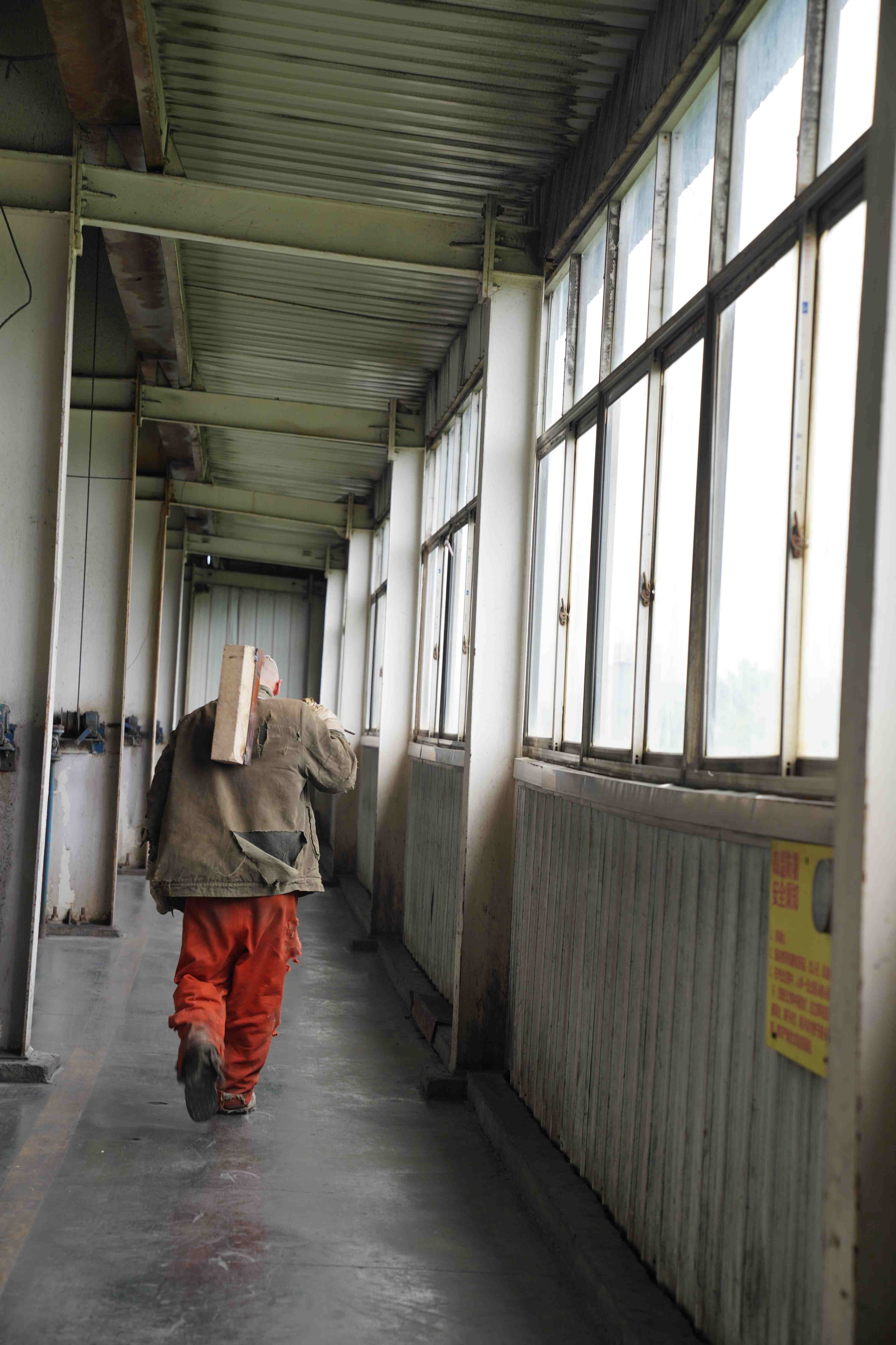 說話間,陸陸續(xù)續(xù)有兩三個工人用工具提著窯磚,從小爐里走出來。摘下銀色的防火面罩,他們通紅、濕潤、生動的臉露了出來。脫掉沉重的防火棉服,空氣里便彌漫開濃濃的汗水味。他們緩步走向窗戶,想讓室外的風吹干一身粘膩的汗。
