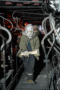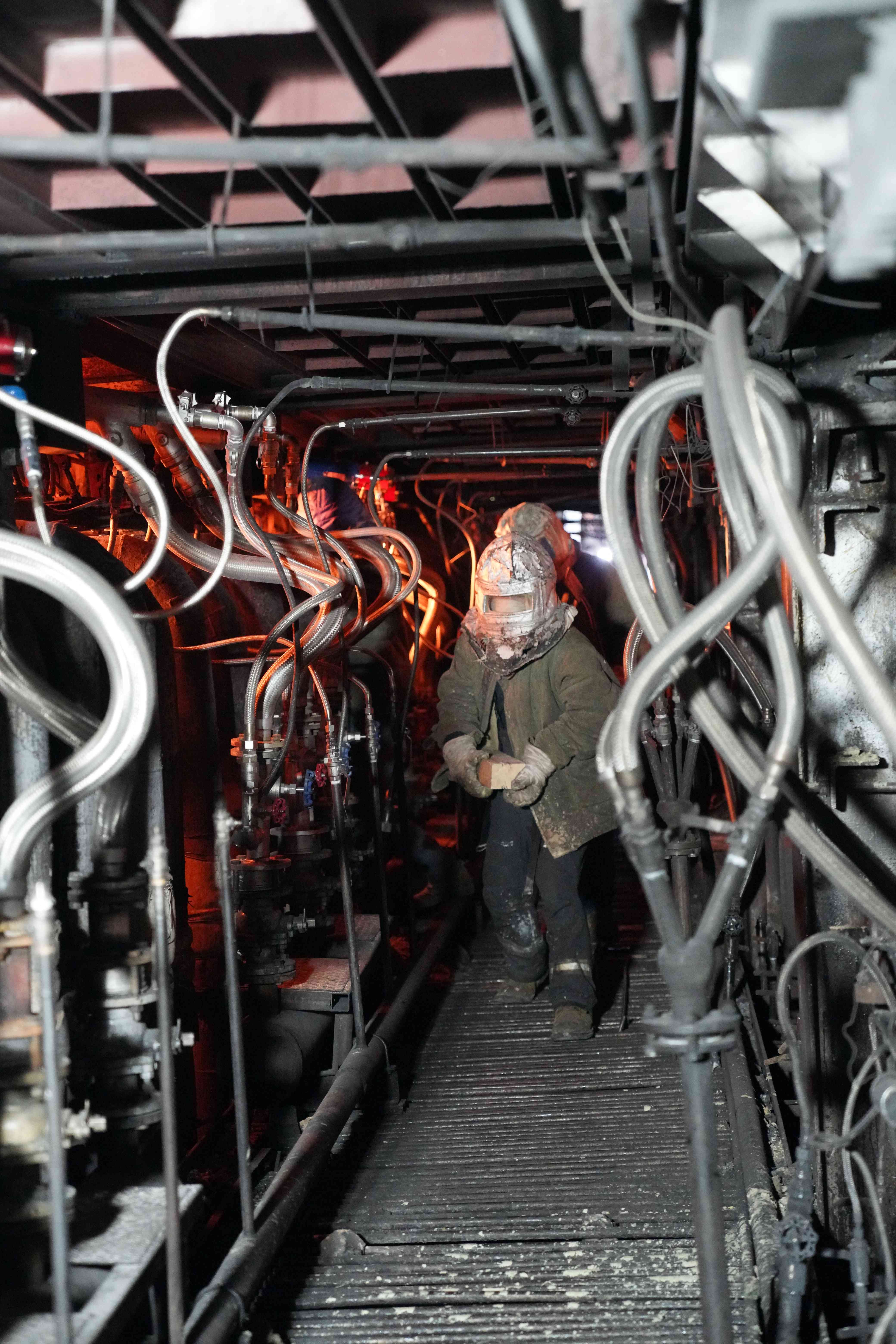 機電科的彭師傅是在廠里工作了20多年的老工人。這會兒他正穿著厚厚的防火服,戴著口罩、手套,拿著電焊工具,蹲在小爐前等著里面的同事,再過一會兒,就該輪到他進去工作了!艾F(xiàn)在在里面做事的是保窯工,今天我們要更換上間隙磚。窯爐后期,這些間隙磚容易開裂、脫落,經(jīng)常要維修、更換!迸韼煾蹈嬖V記者,窯爐內部溫度最高達1600℃,小爐通道的溫度也近90℃,每次工人進去最多10分鐘就要出來透氣,否則容易高溫缺氧。
