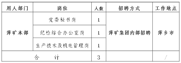 因工作需要,我司招聘黨委秘書(shū)崗、紀(jì)檢綜合辦公室崗、生產(chǎn)技術(shù)及機(jī)電管理崗各1人,現(xiàn)將有關(guān)事項(xiàng)公告如下: 一、招聘崗位及人數(shù)、范圍