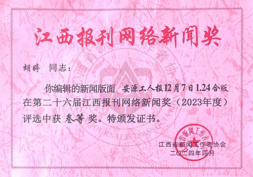 日前,第二十六屆江西報刊網(wǎng)絡(luò)新聞獎評選結(jié)果揭曉,江西安源工人報社謝紅英撰寫的《百年萍礦櫛風(fēng)沐雨初心不改的“紅色密碼”》和胡婷編輯的《安源工人報》12月7日1、24合版2件作品獲三等獎。