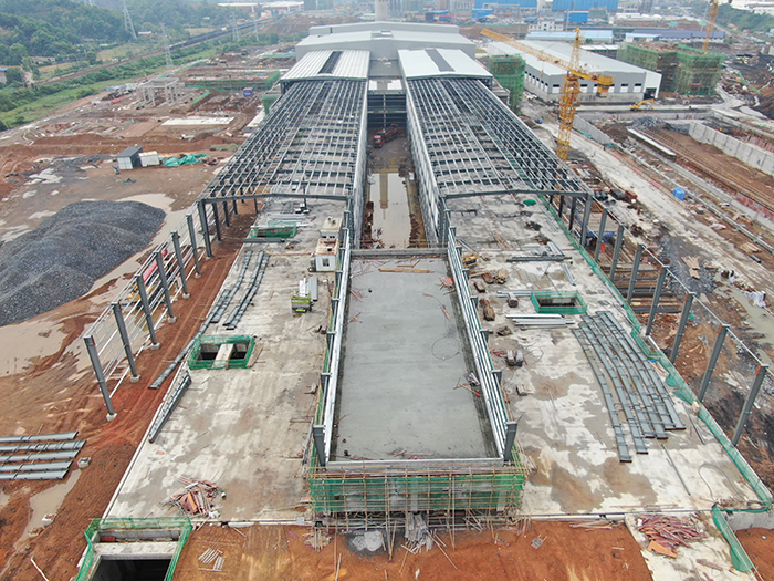 熔化工段:基礎(chǔ)、主體工程已完成,鋼結(jié)構(gòu)吊裝完成98%。 窯爐和錫槽:700噸生產(chǎn)線錫槽鋼結(jié)構(gòu)平臺完成88%,700噸窯爐砌筑完成48%。 成型工段:700噸生產(chǎn)線車間鋼結(jié)構(gòu)完成95%,500噸生產(chǎn)鋼結(jié)構(gòu)完成88%。