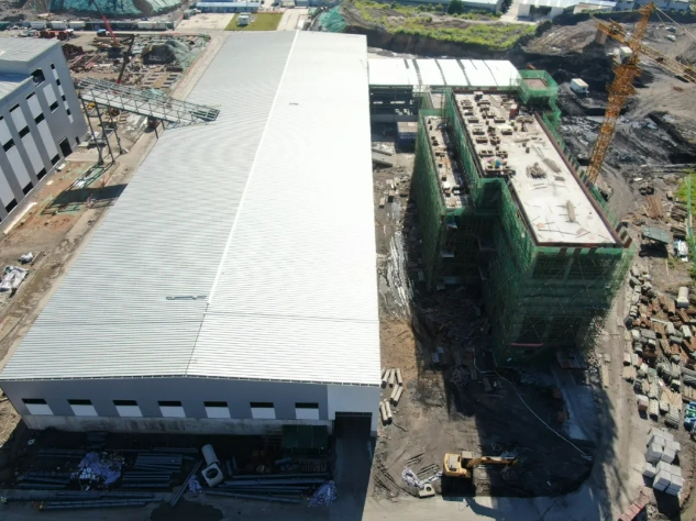 綜合原料庫:基礎(chǔ)工程完成,鋼結(jié)構(gòu)安裝完成95%,墻面板安裝完成75%。