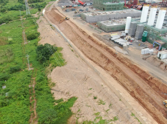 均化庫:基礎(chǔ)工程完成98%,擋土墻墻身完成95%,鋼結(jié)構(gòu)安裝完成75%。