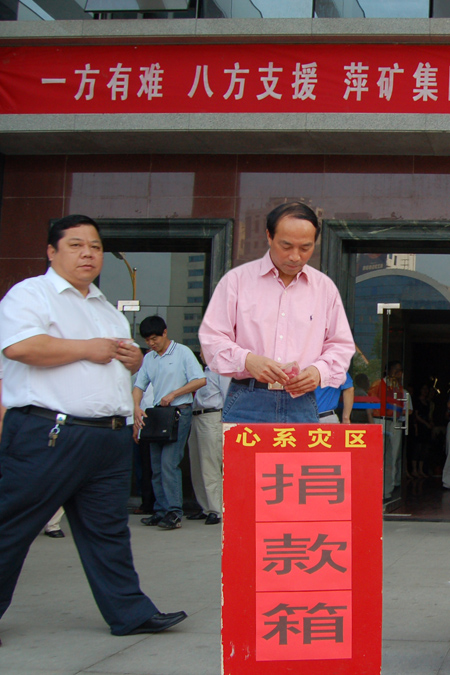汶川地震的第二天,安源煤礦率先組織義捐活動(dòng),捐得善款7萬多元,八十高齡的退休職工李炳炎,步行數(shù)華里來到捐款現(xiàn)場(chǎng),深情地向捐款箱投下了200元。5月15日,高坑煤業(yè)公司組織向?yàn)?zāi)區(qū)人民獻(xiàn)愛心捐款活動(dòng),短短一個(gè)小時(shí)就收到捐款19405元。剛剛進(jìn)礦幾天的新工人季昌高毫不猶豫地捐出100元。煤坪職工易維德夫婦在礦里組織義捐活動(dòng)前,將自己省吃儉用節(jié)約的2000元悄然捐到 了市紅十字會(huì)。5月16日,公司機(jī)關(guān)黨委舉行“一方有難,八方支援,向?yàn)?zāi)區(qū)人民獻(xiàn)愛心”大型義捐活動(dòng),僅僅利用早上上班時(shí)的幾十分鐘,就收到善款18萬多元。同日,白源礦1326人參加義捐活動(dòng),共捐得善款53126元。