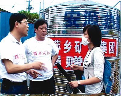 中興公司副總經(jīng)理吳祖林與安源熱能公司總經(jīng)理管光周 接受江西電視臺五套記者采訪。(黃領(lǐng) 攝) | 5月18日,安源熱能公司的同志通過四川綿陽的經(jīng)銷商得知,大量災(zāi)民自地震以來一直洗不上熱水澡,心情非常沉重。安源熱能公司的同志很想用自己生產(chǎn)的熱能熱水機組幫助災(zāi)區(qū)人民,這一想法得到了集團公司的支持,決定向綿陽市捐獻兩臺價值30萬元的RS-89型20噸大功率熱能熱水機組。這一決定得到了綿陽市紅十字會的歡迎。這是萍礦人直接服務(wù)災(zāi)區(qū)人民的一件大事,接到熱能機組的生產(chǎn)任務(wù)后,安源熱能員工傾注了很大的熱情,大家加班加點,僅用20多個小時就將兩臺RS-89型熱能機組完成生產(chǎn)組裝和調(diào)試。5月20日披掛著“萍礦集團公司向災(zāi)區(qū)人民獻愛心”的大型卡車,滿載著17萬萍礦職工家屬的深情厚意啟程出發(fā)。集團公司董事長、黨委書記彭志祥,黨委副書記黃建明親自為熱能機組車隊送行。5月21日晚上10點歷經(jīng)32小時,安源熱能機組送達綿陽市九州體育館。熱能機組安裝人員不顧長途勞累,下了車就立即安裝施工,經(jīng)過一個通宵的奮戰(zhàn),到第二天上午10點,讓地震后10天沒有洗過澡的災(zāi)民洗上了熱水澡。綿陽市工會副主席夸贊安源熱能的同志:“工人階級真了不起,一個晚上這里就發(fā)生了變化!本d陽市直工委書記李川萍說:“災(zāi)民通過洗澡,才真正有了重生的感覺。”他對災(zāi)民說:你們洗澡的設(shè)備是萍礦集團公司捐贈的,他們來自江西安源。5月22日,中央電視臺記者柴靜向“抗震救災(zāi)、眾志成城”特別節(jié)目發(fā)回報道:我剛從綿陽九州體育館出來,今天有一個很好的消息,從江西的安源送來的一臺大功率熱能機組,讓500多人洗上了熱水澡,這是災(zāi)民自地震以來第一次洗澡!边@則短新聞,讓災(zāi)區(qū)人民記住了江西安源,記住了萍礦集團。