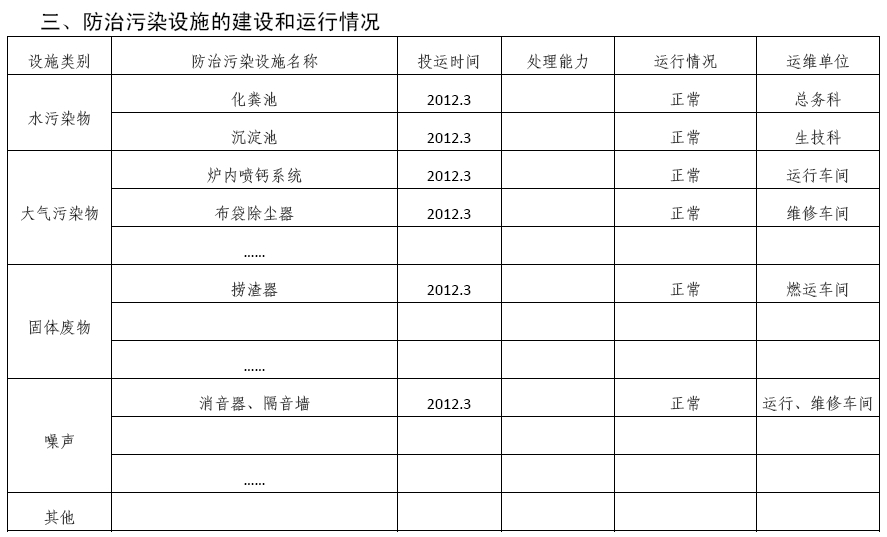 填表說(shuō)明: 1、排放口編號(hào)或名稱應(yīng)與排污許可證上載明的一致,排放口位置為排放口所在的經(jīng)緯度,排放方式為納管或排環(huán)境,排放濃度為最近一次監(jiān)測(cè)數(shù)值,監(jiān)測(cè)方式為手工或自動(dòng),排放總量為最近一次的年度實(shí)際排放總量,核定的排放總量為排污許可證上載明的核定排放總量或環(huán)評(píng)批復(fù)上允許的排放總量。 2、污染源自動(dòng)監(jiān)控系統(tǒng)作為環(huán)境保護(hù)設(shè)施的組成部分,應(yīng)在防治污染設(shè)施的建設(shè)和運(yùn)行情況中予以公開(kāi),并在處理能力中填寫(xiě)監(jiān)測(cè)指標(biāo)。 3、企業(yè)事業(yè)單位環(huán)境信息涉及國(guó)家秘密、商業(yè)秘密或者個(gè)人隱私的,依法可以不公開(kāi),法律、法規(guī)另有規(guī)定的,從其規(guī)定。