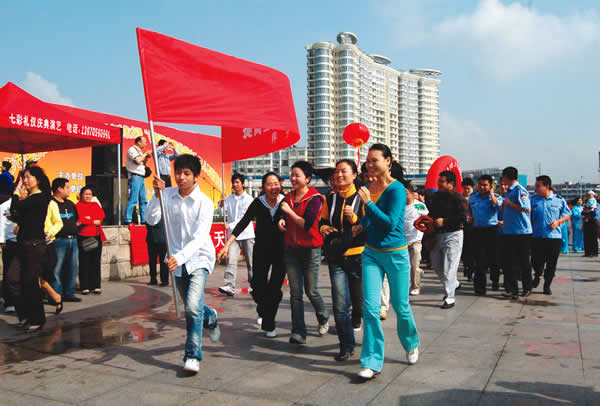 4月20日上午九點,秋收起義廣場長廊舞臺彩旗飄揚,上萬名市民、運動員聚集在此,在1000名老人整齊和壯觀的“八段錦”拳后,市委書記劉和萍宣布:萍鄉(xiāng)市國慶60周年全民健身活動暨“爭創(chuàng)國家園林城市”萬人環(huán)城接力跑開始!起點處數(shù)百身著運動服的運動員在奧運火炬手的帶領(lǐng)下,開始了萬人環(huán)城接力跑活動。