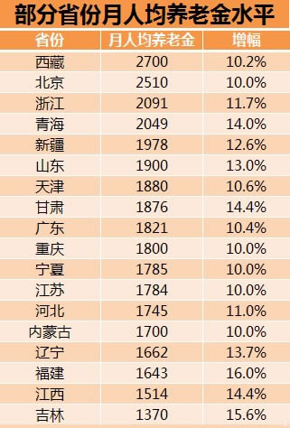 從增幅看,這18個(gè)省份月人均養(yǎng)老金水平的增幅均在國(guó)家規(guī)定的增幅(10%左右)以上,其中,福建增幅最高,為16%左右。